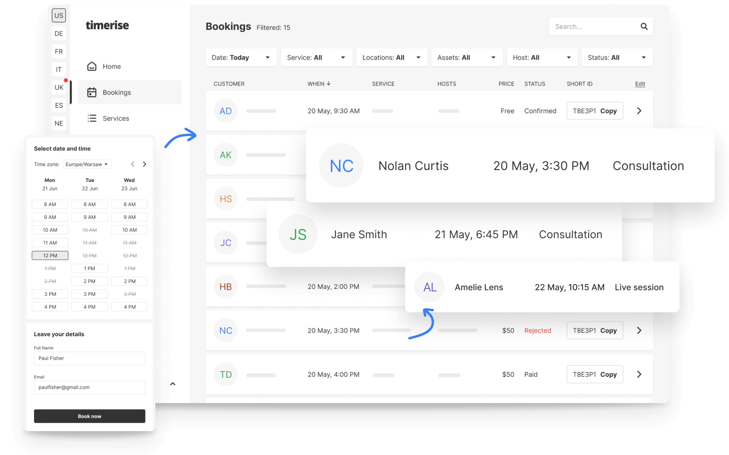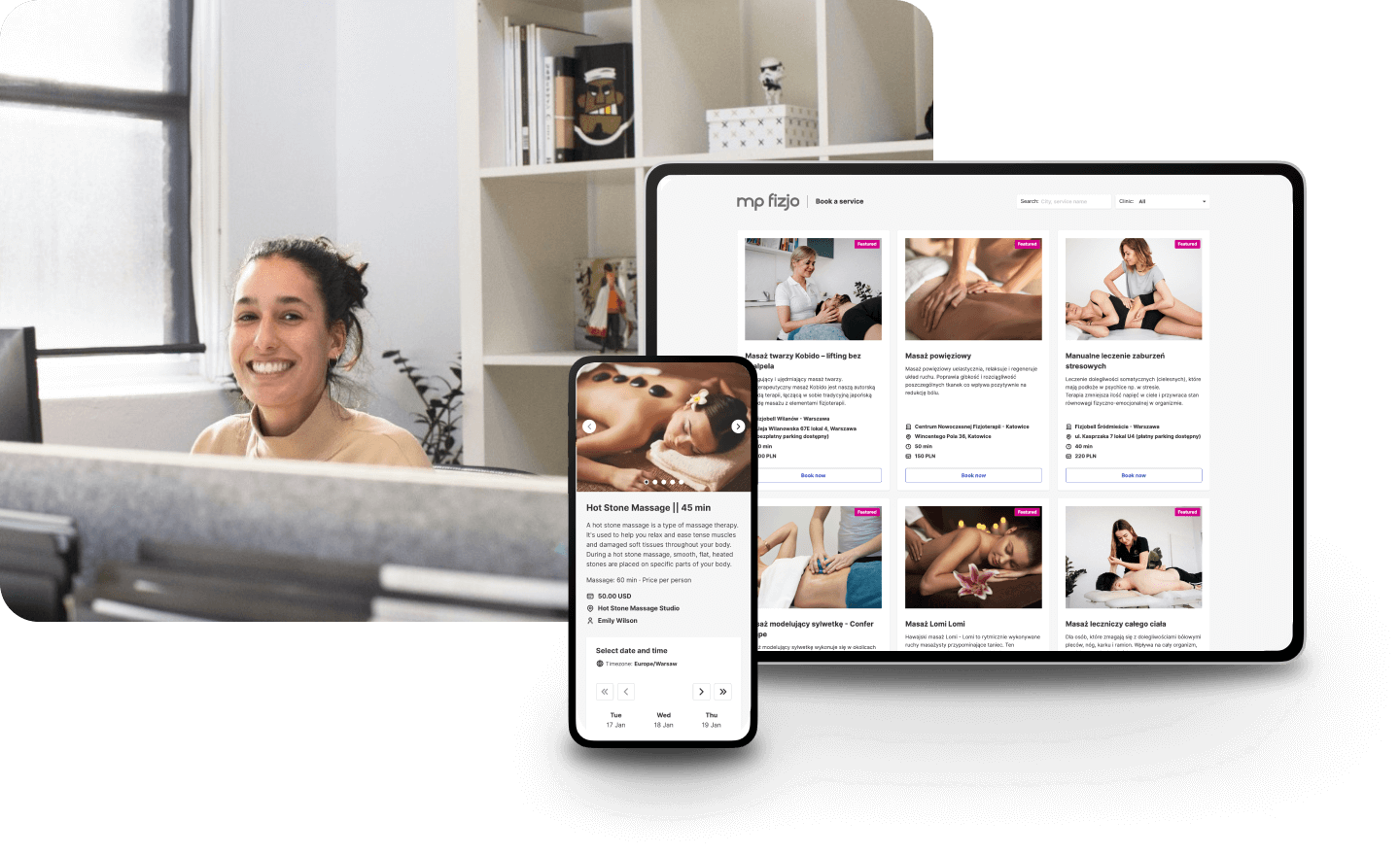 Bez względu na to, czy prowadzisz usługi z zakresu urody i odnowy biologicznej, medycyny, sportu i fitnessu, fizjoterapii, coachingu czy doradztwa. Timerise oferuje system planowania online, który minimalizuje liczbę nieobecności i ma wszystko, czego potrzebujesz – przypomnienia, płatności i wiele więcej!